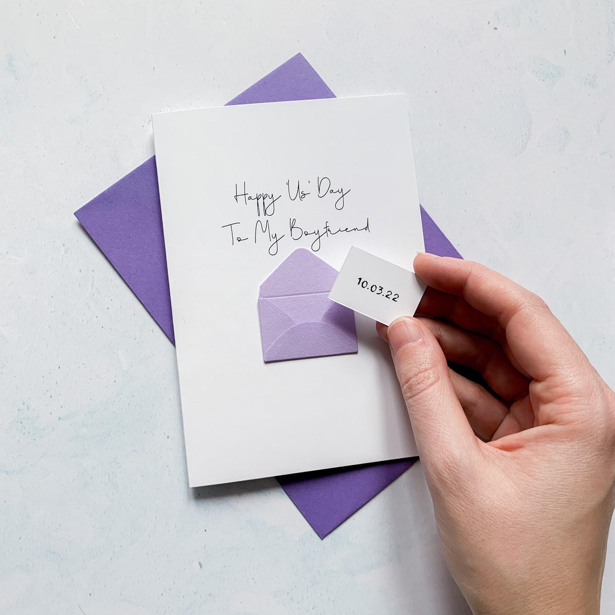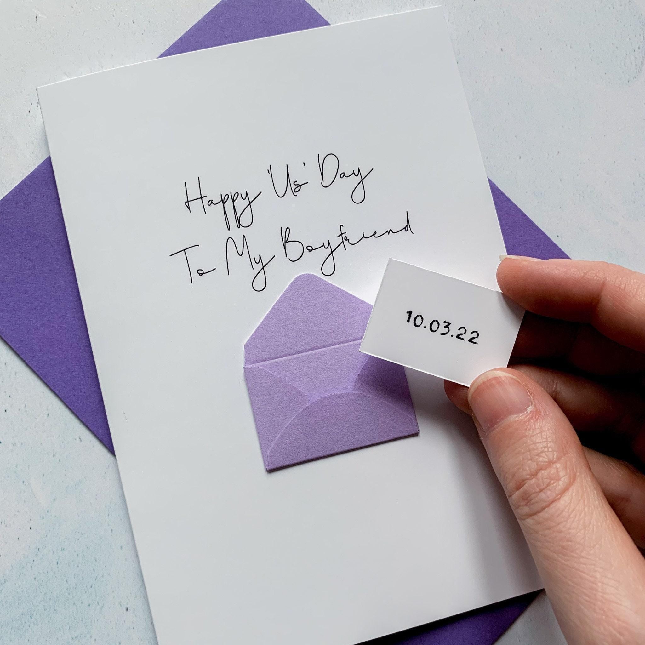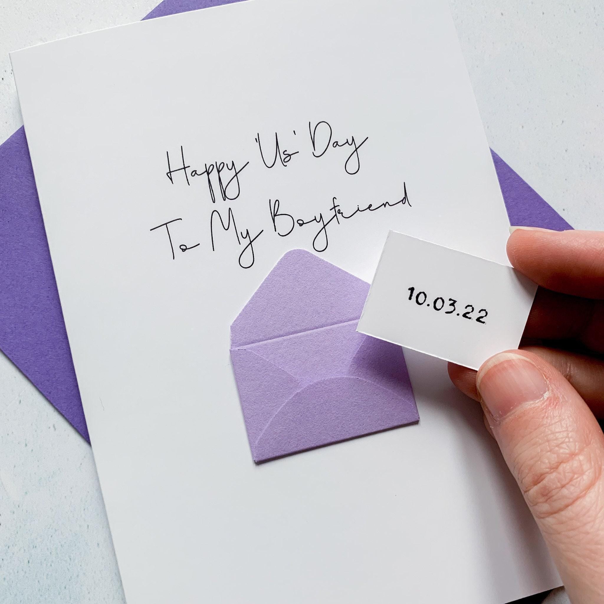 A personalised, romantic card, perfect to gift to your boyfriend to celebrate your years together. Ideal as a 1st Anniversary card, a 10th Anniversary card, or any Anniversary you wish to celebrate. Your special date or secret message is hidden inside a handmade mini envelope, beneath the words "Happy Us Day". A perfect romantic card for him! It's the perfect sentimental keepsake to celebrate your love!
