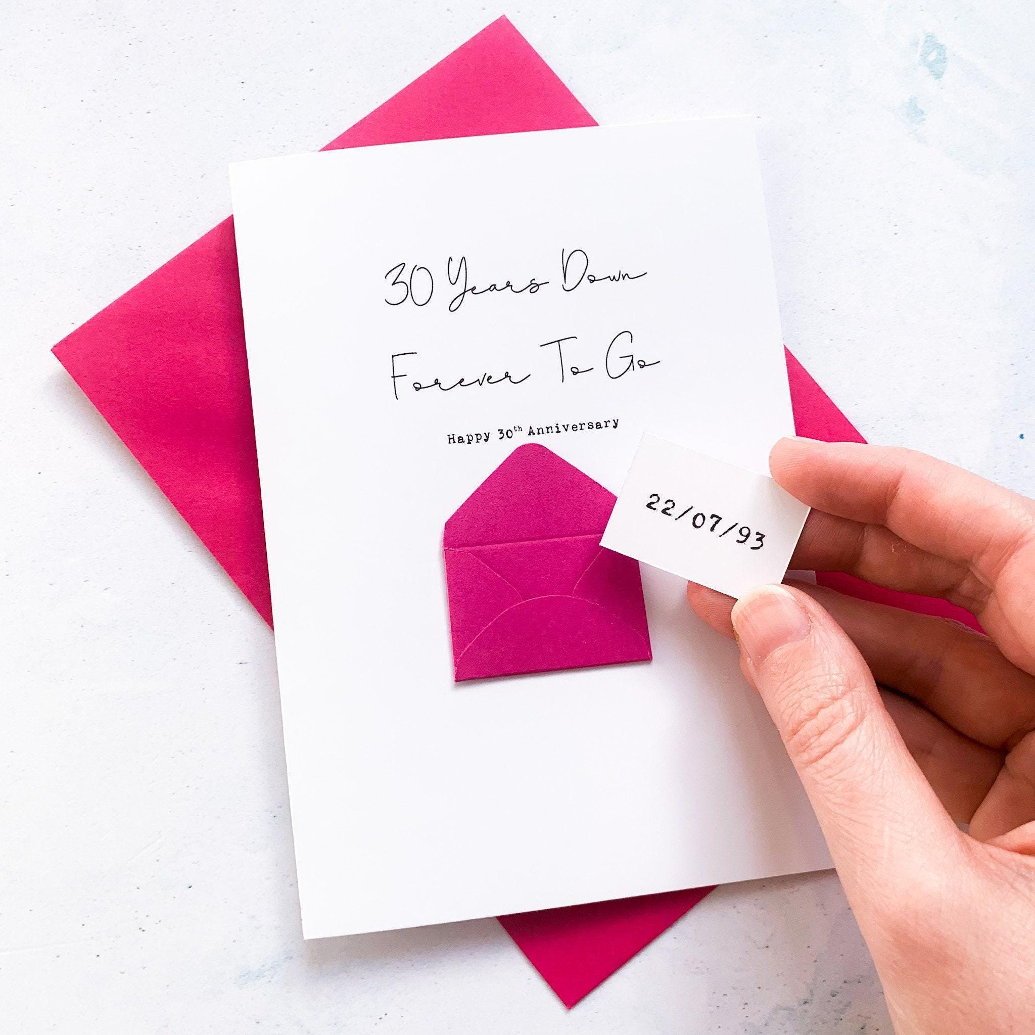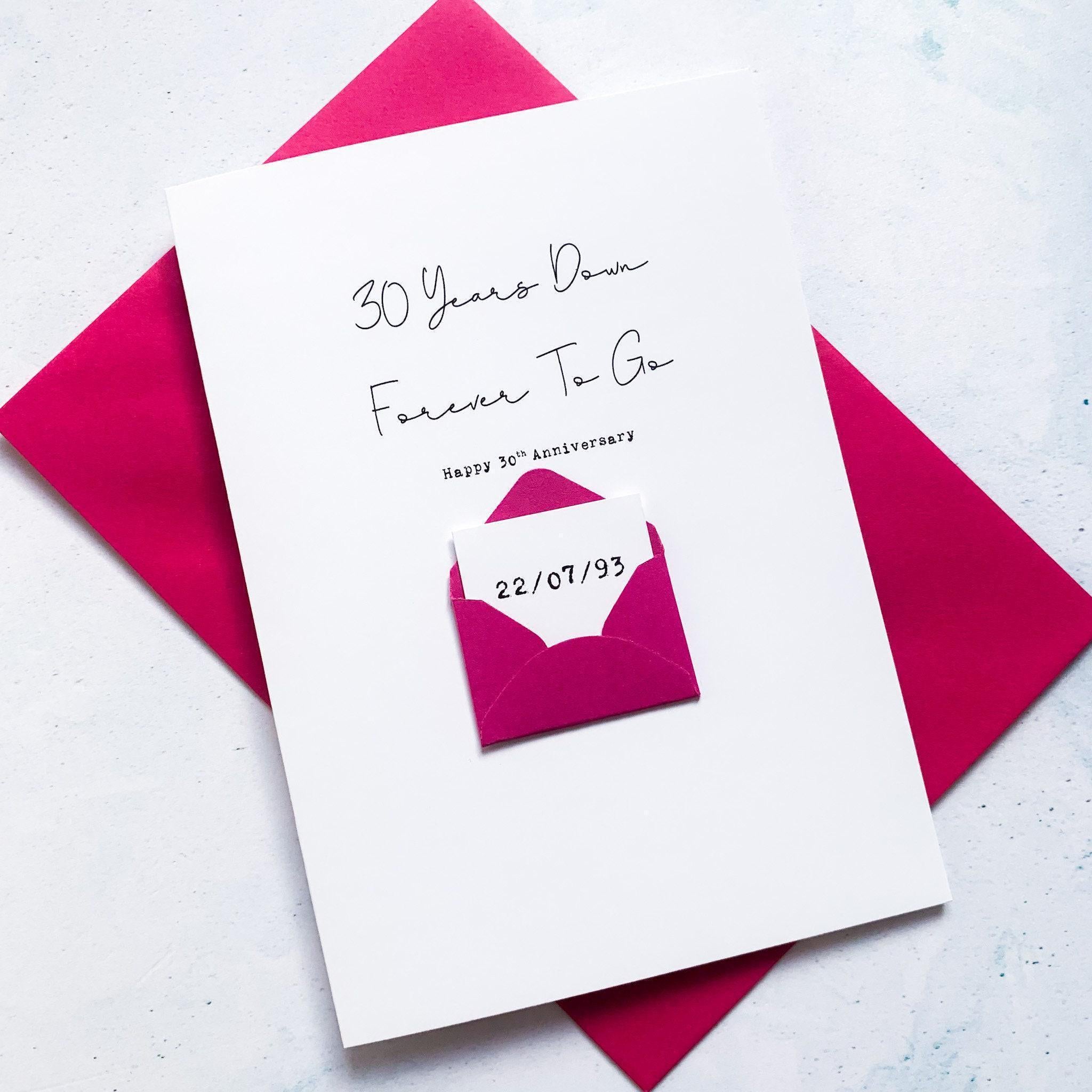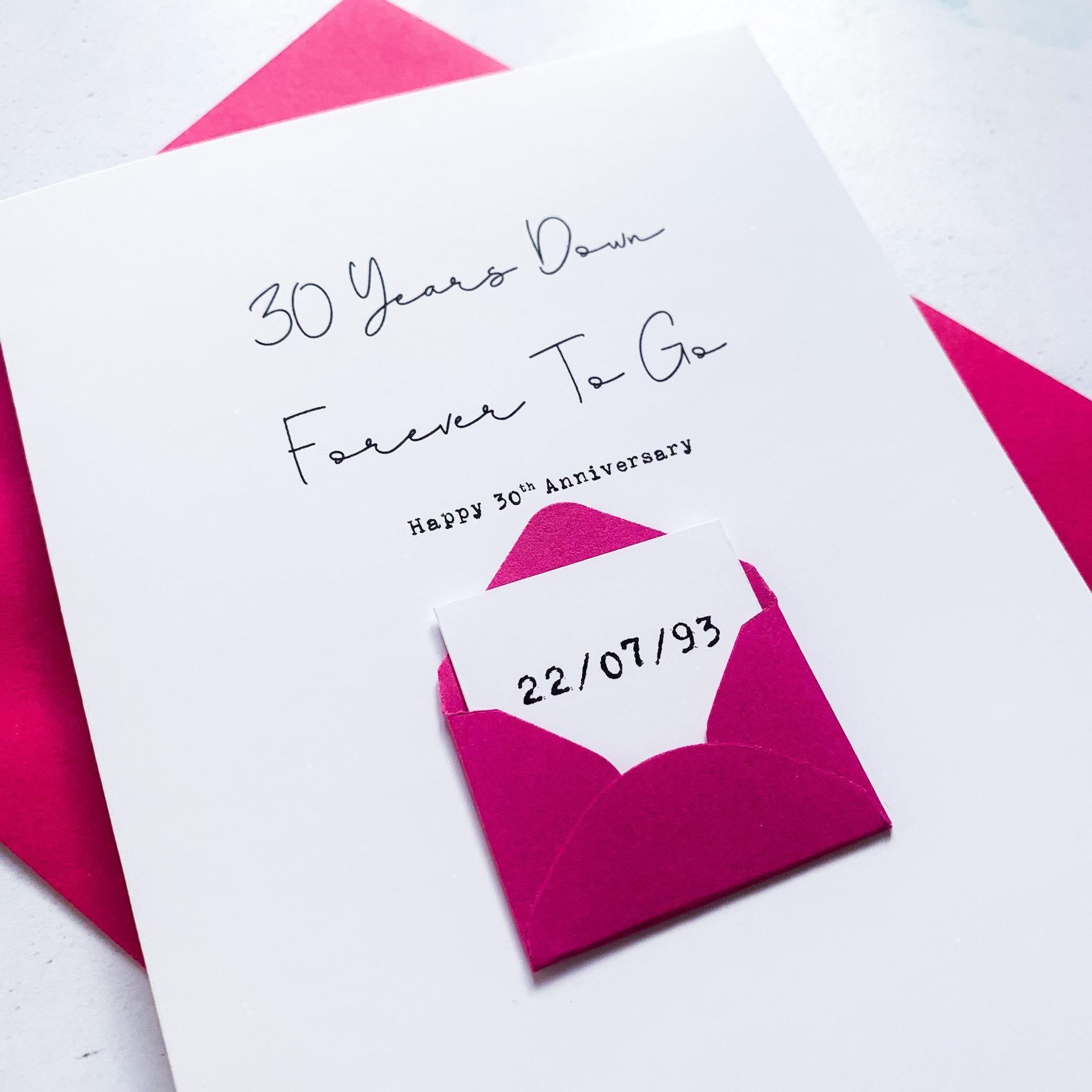 A quirky personalised greeting card to celebrate your loved ones on your anniversary with a secret message inside a mini handmade envelope, beneath the words "30 Years Down, Forever To Go".