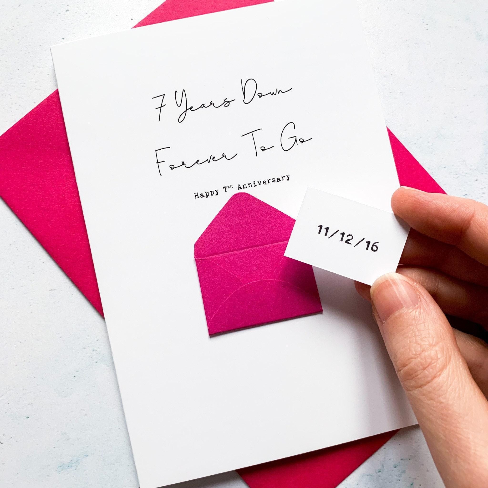 A quirky personalised 7th anniversary card to celebrate your husband or wife on your anniversary with a secret message inside a mini handmade envelope. The front reads the verse "7 Years Down, Forever To Go - Happy 7th Anniversary". Ideal to send to your husband or wife on your seventh wedding anniversary or to your girlfriend or boyfriend to celebrate 7 years together. It's the perfect handmade keepsake gift for your partner!