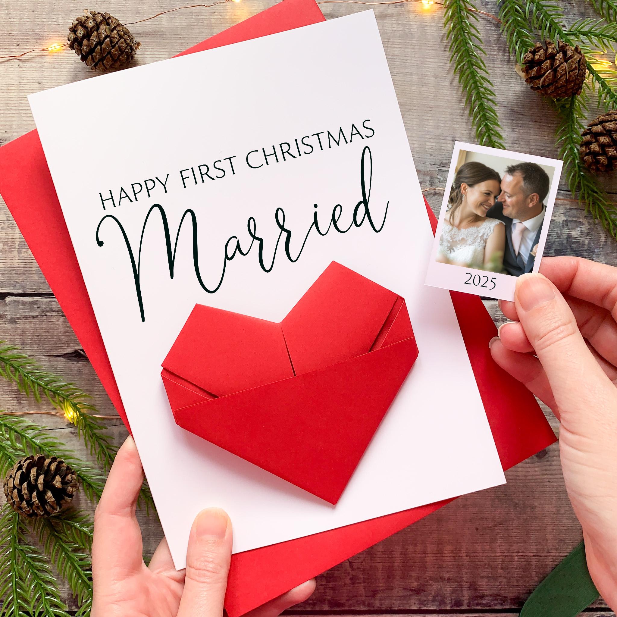 This personalised Christmas card is perfect for couples celebrating their first Christmas married, combining artistry with heartfelt sentiment. The delicate origami design enhances the tactile experience while the photo holder card allows you to add a meaningful image from your wedding year. Whether you give this as a wedding anniversary card or a heartfelt holiday message, it stands out as an exceptional keepsake gift husband or wife will treasure.